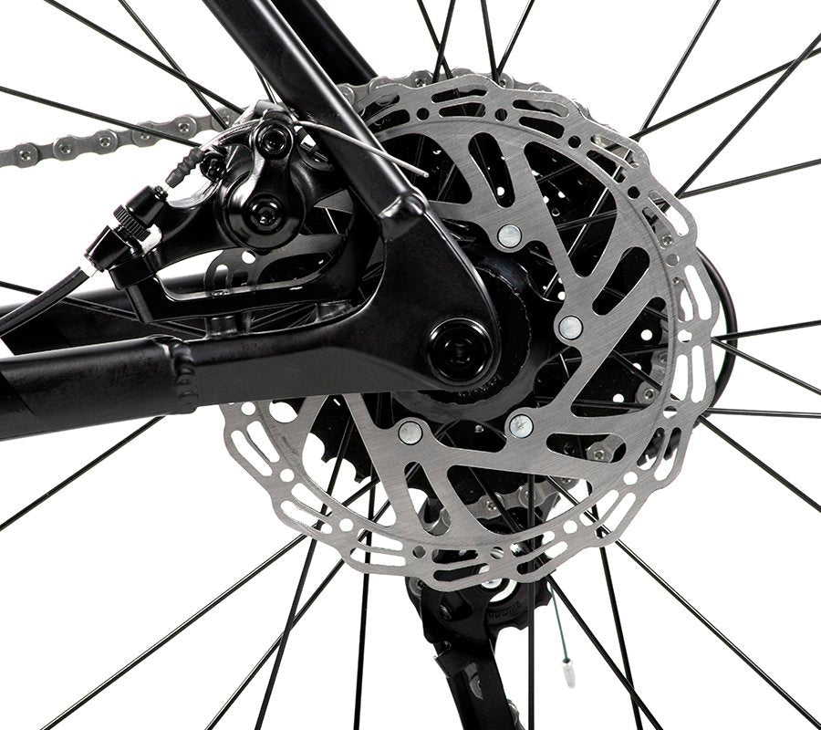 Tektro Mira disc brakes provide consistently reliable stopping power in all-weather conditions. The wheels feature lightweight rims built on thru-axle Shimano hubs. The frame can accommodate tires up to 700x32.